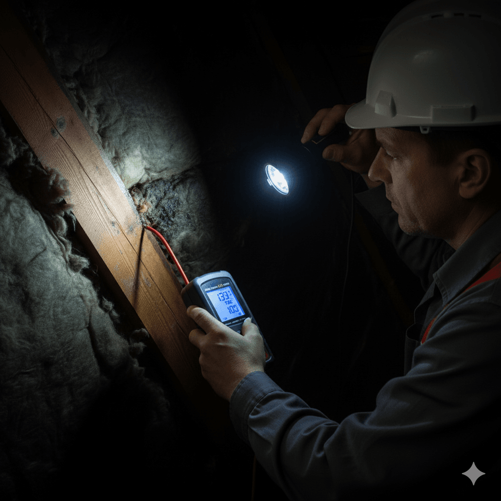Coupez l’éclairage et utilisez une lampe puissante pour mieux voir. Cherchez des traces de coulures sur les chevrons, du bois gonflé et de l’isolant détrempé. Distinguez le point d’entrée et le point d’apparition: l’eau peut parcourir 1 à 3 mètres avant d’apparaître. Contrôlez les zones autour des percements: velux, antennes, conduits. Mesurez l’humidité: une condensation peut mimer une fuite et fausser le diagnostic. Ces observations dans les combles vous orientent vers la méthode de détection sans casse la plus pertinente.